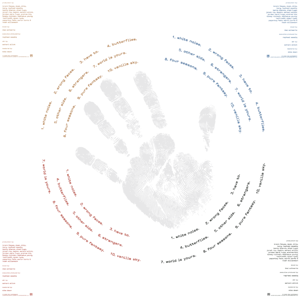 The featureless album includes production by Faiyaz, Saadiq, Chad Hugo, Benny Blanco, Dpat, Jordan Ware, Dilip, Tommy Richman and more, with mixing by Itai Schwartz and mastering by Mike Dean.