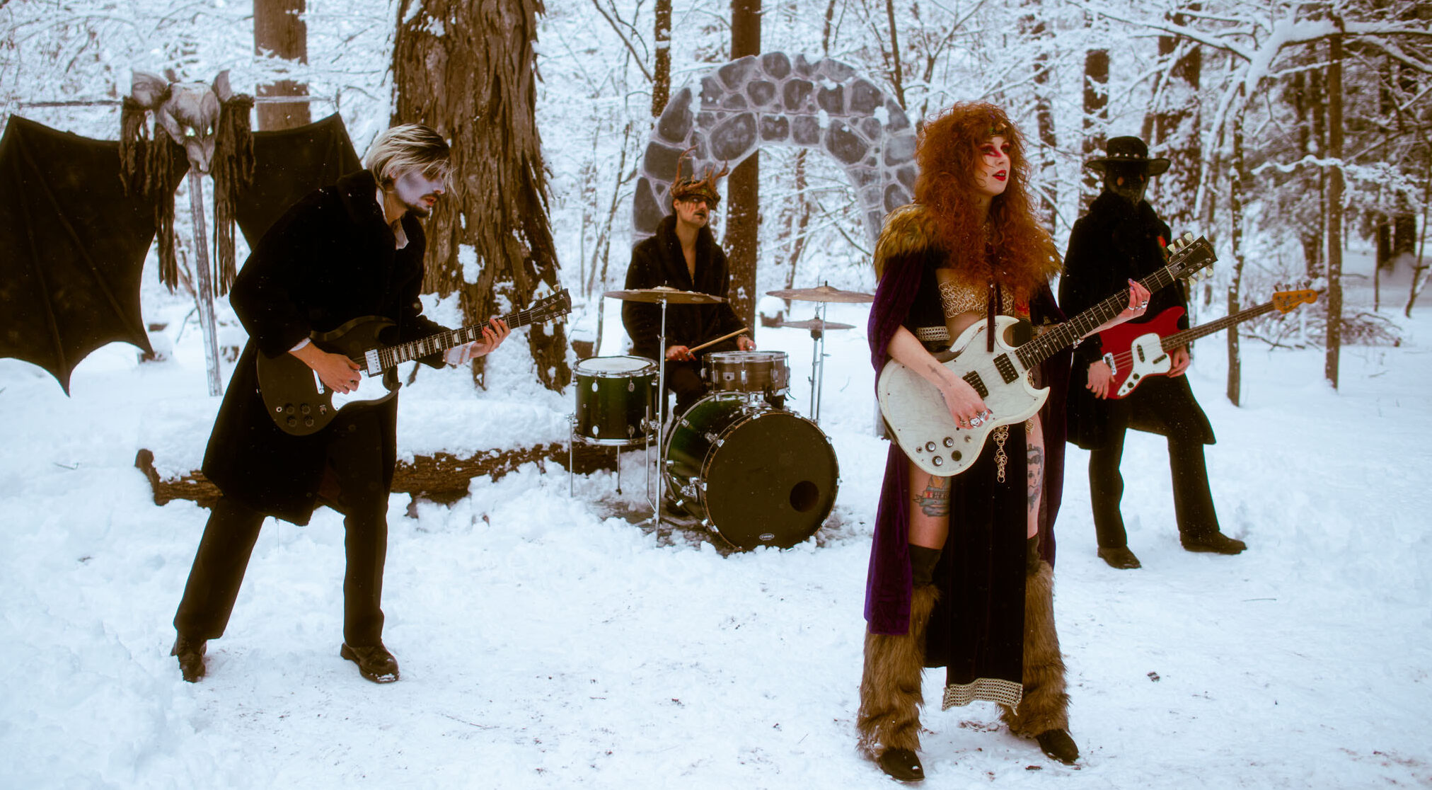 New York City is definitely known for being overrun by rats, and you can add Brooklyn psych doom cult Castle Rat to the infestation. This retro-sounding quartet—Riley Pinkerton (vocals/guitar/”Rat Queen”), Franco Vittore (lead guitar/”Count”), Ronnie Lanzilotta III (bass/”Plague Doctor”), Josh Strmic (drums/”The All-Seeing Druid”)—have conjured a brand new video for the slow-building, doomy track, “Cry For Me,” in anticipation of the release of their debut full-length, Into the Realm. The video, shot and directed (on VHS, no less) by Kathryn Barnish, offers a surreal, Medieval battle between the Rat Queen (Pinkerton) and the Rat Reaperess (Maddy Wright) in a snowy landscape. Though large swords and scythes are brandished, the video is surprisingly (mostly) blood and gore free.